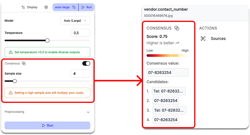 Consensus reduces this variability by sending the prompt through K independent model calls and merging their JSON outputs into one result.